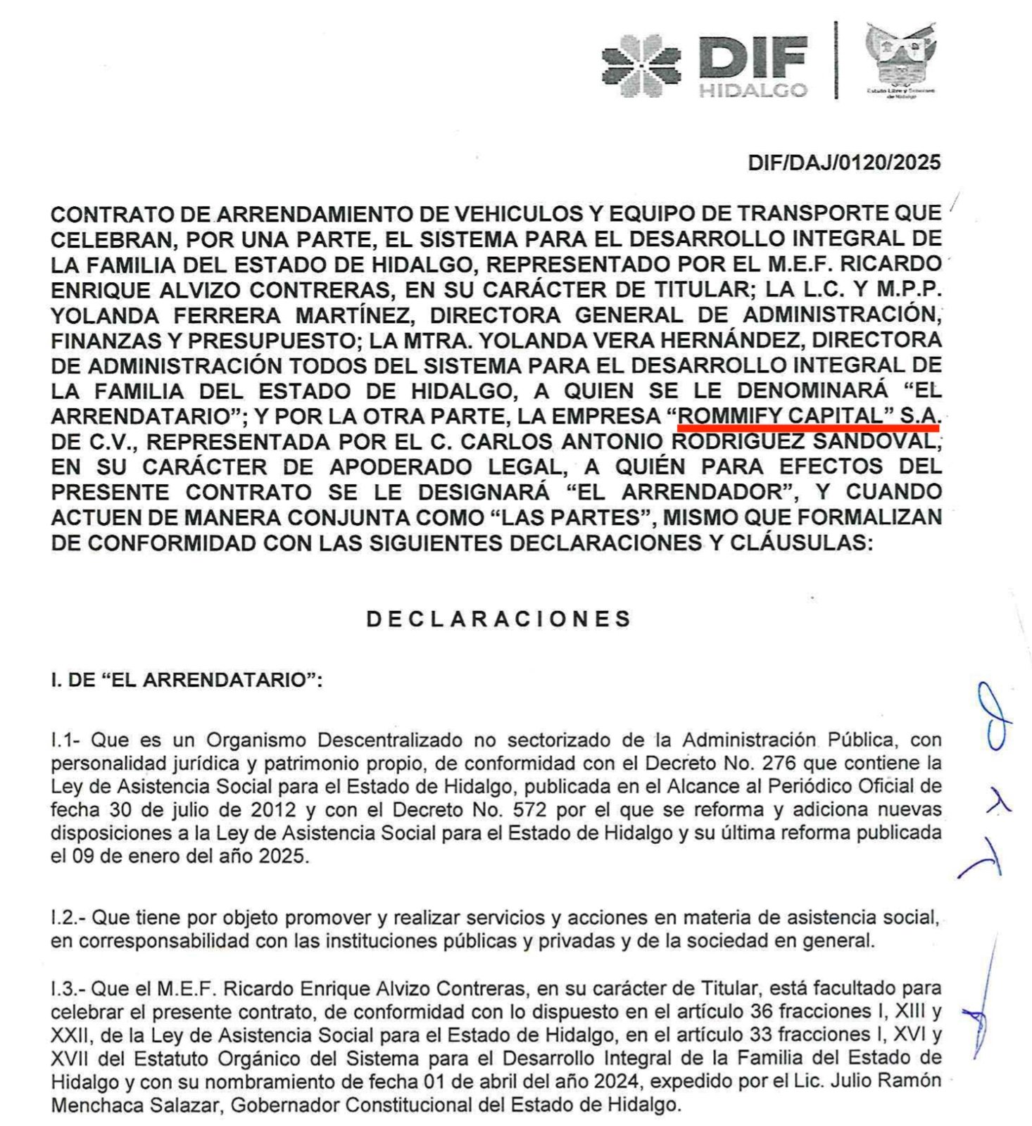 Recientemente firmó el contrato PMMR-SA-026-FORTAMUN-2025, 2 de julio de 2025, para el arrendamiento de patrullas en el municipio de Mineral de la Reforma por un monto de $13,777,737.60 pesos; en el DIF Estatal obtuvo el contrato DIF/DAJ/0120/2025, enero de 2025, para el arrendamiento de vehículos y equipo de transporte 2025-2026 por un monto de $26,352,339.78 pesos; el contrato 034/2025, del 7 de abril 2025, para el arrendamiento 58 camionetas pick up, modelo 2025, por un monto de $23,100,184.32 pesos; el contrato 033/2025, firmado el mismo 7 de abril para el arrendamiento de vehículos por un monto de $12,550,692.38 pesos.