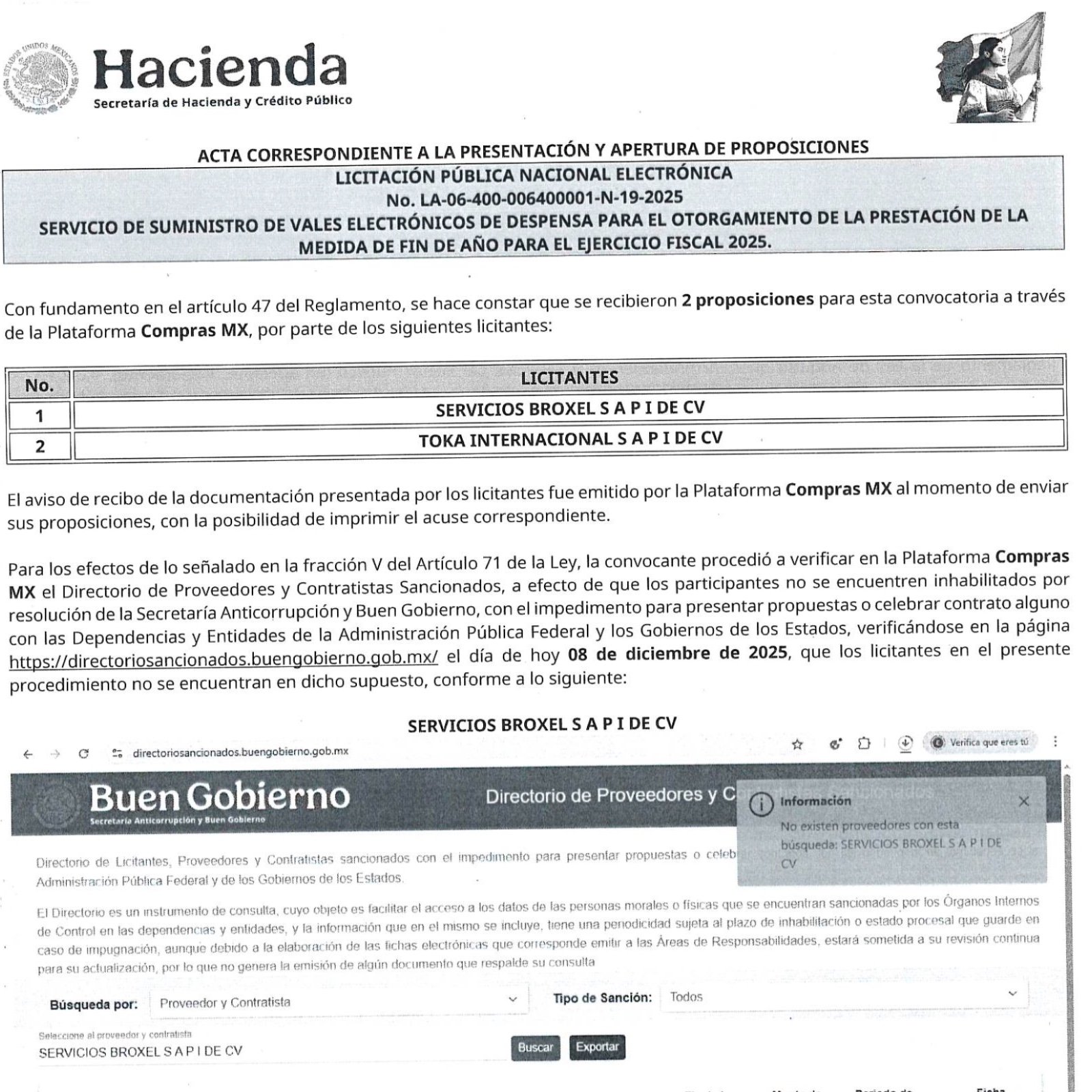 La licitación pública nacional electrónica LA-06-400-006400001-N-19-2025, enfocada en la adquisición de vales electrónicos de despensa para los trabajadores del gobierno federal, pasó este 8 de diciembre a la fase de fallo mientras se revisaban inconsistencias detectadas en la plataforma Compras MX. Entre ellas destacó la ausencia de montos en los campos económicos que debía completar Servicios Broxel, S.A.P.I. de C.V.