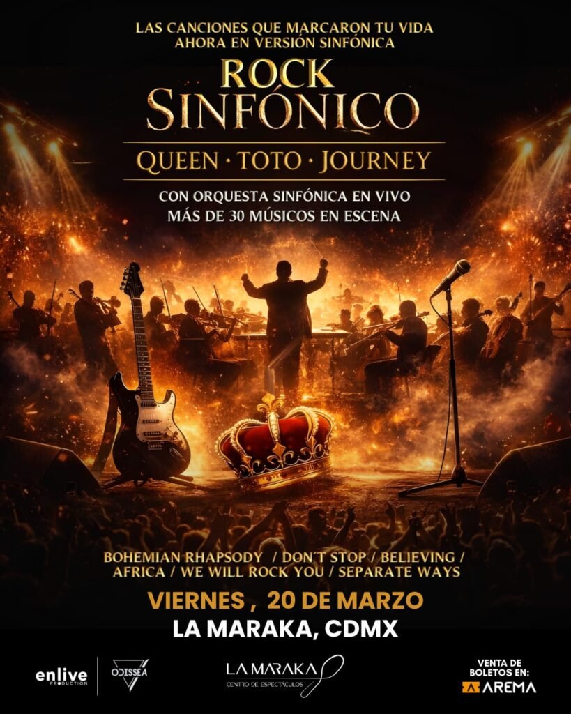 La grandeza del rock clásico, ese lenguaje musical que durante décadas ha acompañado la vida emocional de millones de personas, encontrará una nueva dimensión sonora el próximo viernes 20 de marzo de 2026 a partir de las nueve de la noche; cuando el concepto Rock Sinfónico llegue al Centro de Espectáculos La Maraka de la Ciudad de México, en una velada concebida para reencontrarse con algunas de las canciones más emblemáticas de la historia del género bajo una perspectiva orquestal que promete estremecer a la audiencia. Los boletos ya se encuentran disponibles a través de la plataforma Arema.mx, así como en taquillas del inmueble.