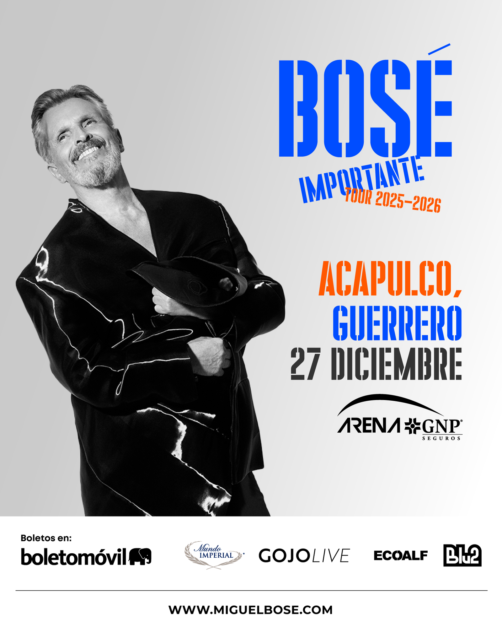 “Traer a Miguel Bosé a Acapulco en estas fechas es un símbolo de esperanza y renacimiento para el puerto. Será un concierto inolvidable, una velada que unirá generaciones”, afirmó Alfonso Barbosa al presentar el evento. Los boletos ya se encuentran disponibles en el sistema Boletomóvil y en taquillas de la Arena GNP Seguros.