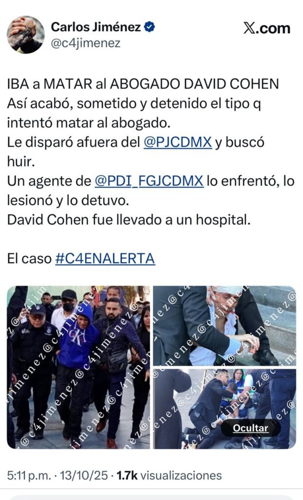 El ataque ocurrió poco antes de las 17:00 horas, cuando Cohen subía las escaleras del edificio José María Morelos, sobre avenida Niños Héroes y Doctor Claudio Bernard, en una de las zonas más transitadas del complejo judicial.