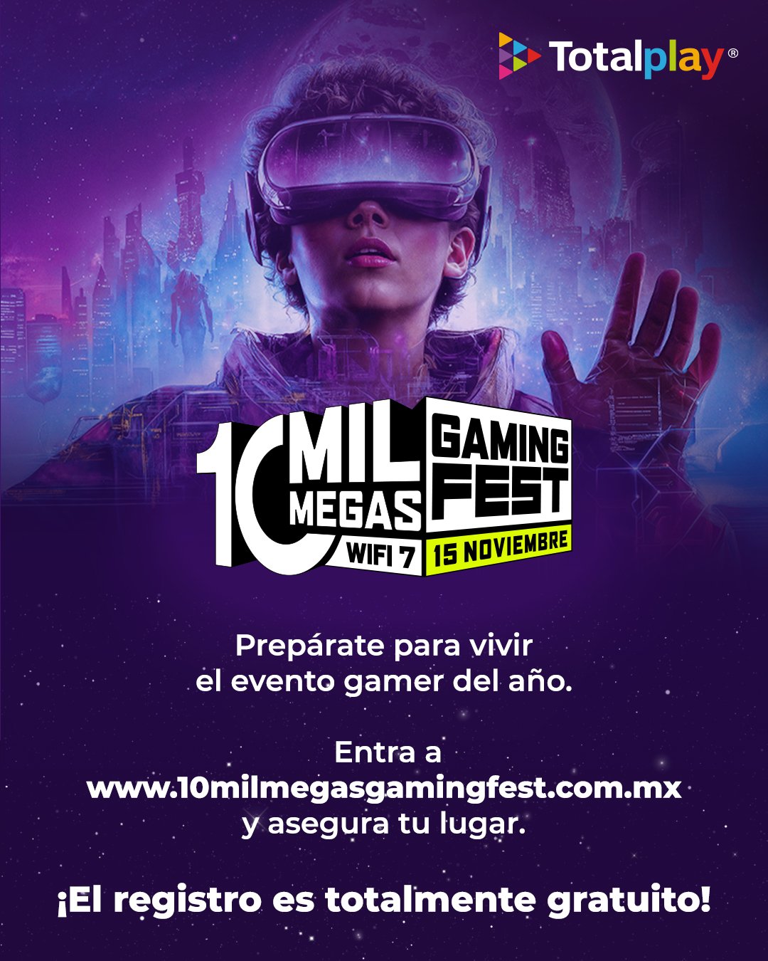 Este 15 de noviembre, el futuro del gaming tiene cita en Azteca Estudios. La entrada es gratuita, el acceso limitado y las emociones infinitas. El resgistro está disponible ya en www.10milmegasgamingfest.com.mx y se invita a la audiencia a estar lista para vivir el poder único de los 10,000 megas de Totalplay.